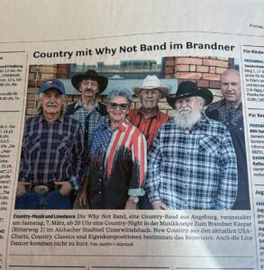 Die leere Tanzfläche der Four Corners Music Hall wird sich am Samstag, 24. März, schnell füllen, wenn die Augsburger „Why Not Band“ ab 20 Uhr ihren Auftritt beginnt. Seit mehr als 30 Jahren touren die sechs Musiker durch Deutschland und das benachbarte Ausland. Im Gepäck haben sie ein umfangreiches Programm aus Country-Klassikern, New-Country, eigenen Songs und natürlich auch immer neue Titel aus den US-Country-Charts. Diese Mischung bietet gerade für die Linedancer ideale Bedingungen, ihre Choreografien auf das Parkett des Four Corners zu bringen.